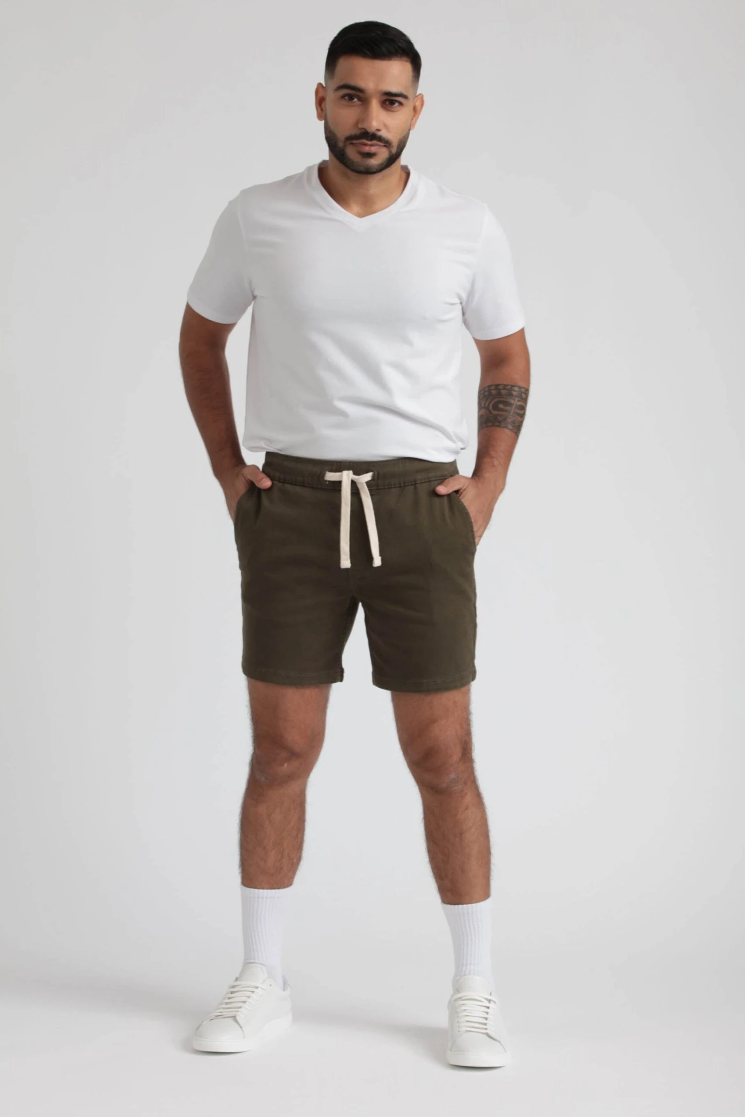 Our shorts are super soft, comfortable and stretchy for hot weather festivities. The magic fabric is light, breathable knit denim. There’s also no zipper, buttons or belt loops — pull them up and on, tighten with the drawstring (easy and convenient). We put standard chino pockets on the front and a roomy back pocket for a wallet or “the goods.” We also added a small locker loop for key-chain if you need. All adds up to JEANIUS.