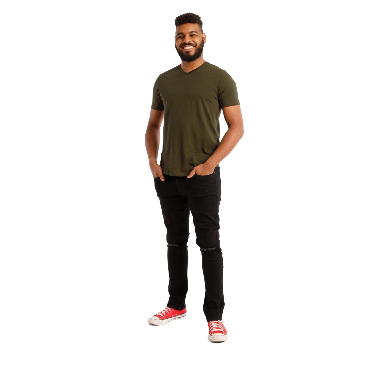 Jet black wash with minimal high lows combined tears at the knees with an abrasion on the upper thigh for that extra fashun (we say rips are in yo!). Rinse wash with no distressing.