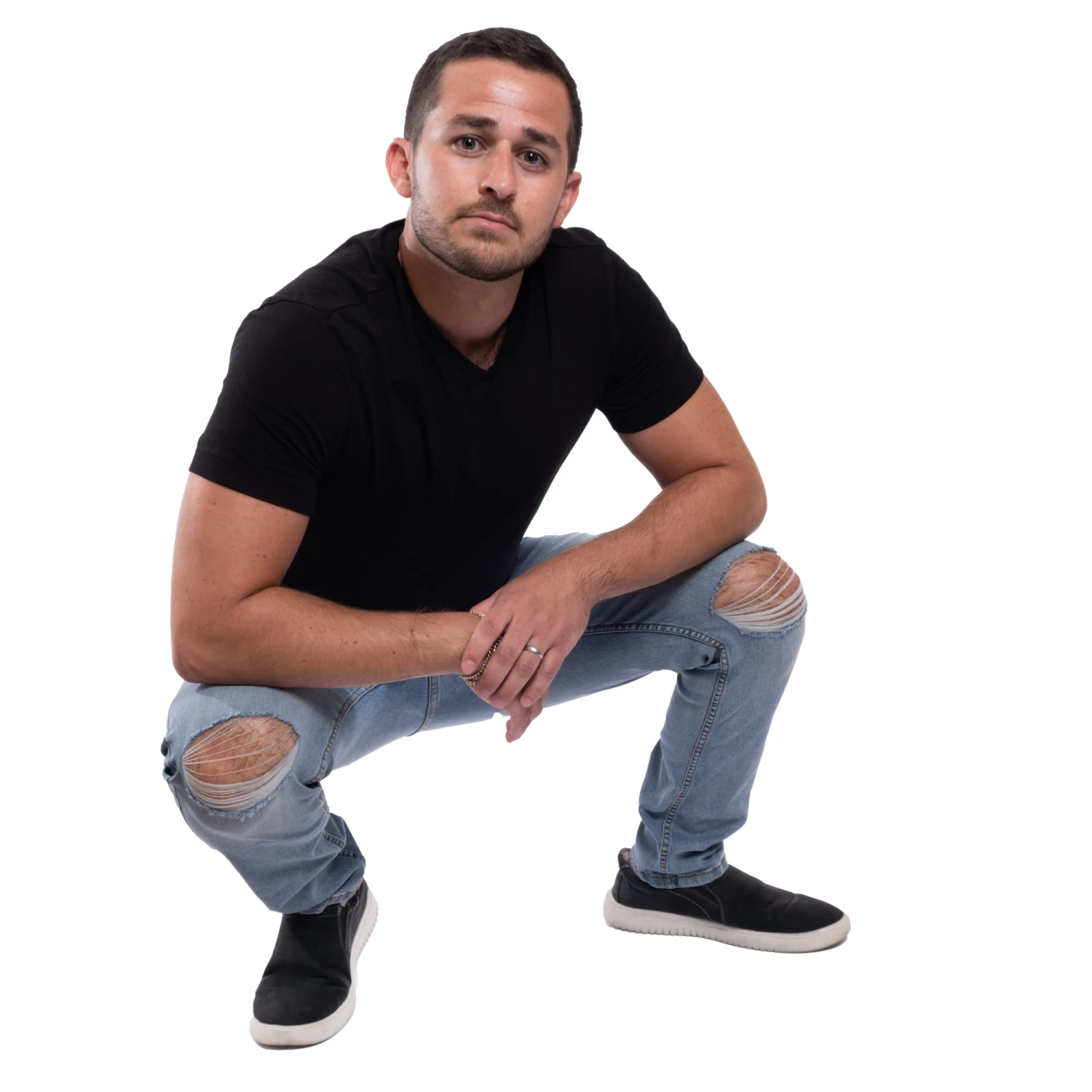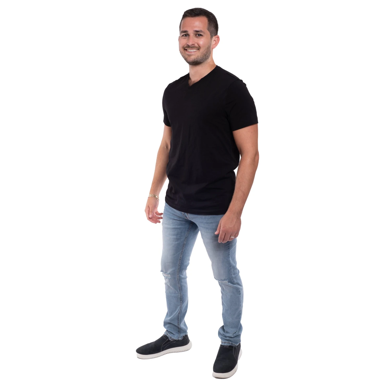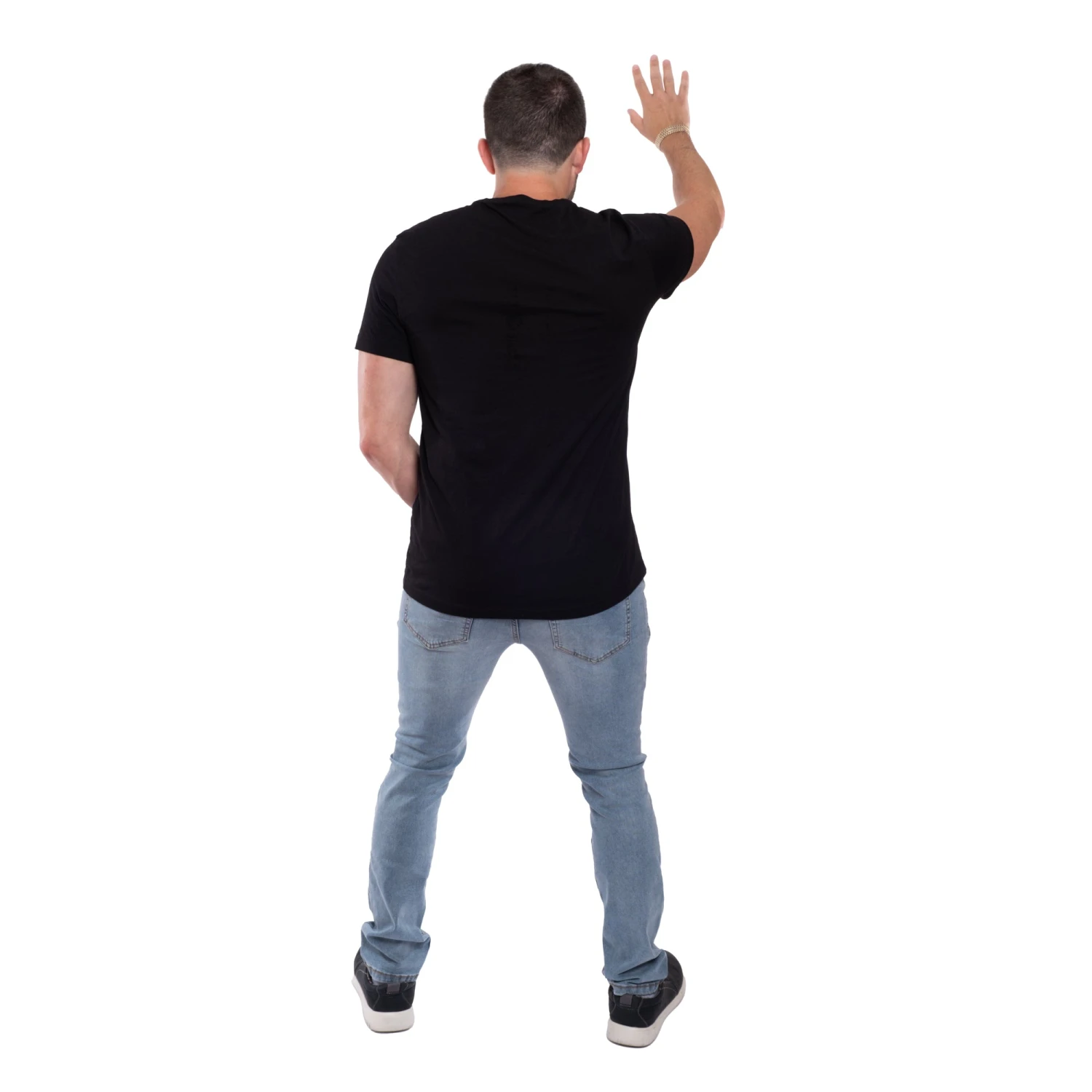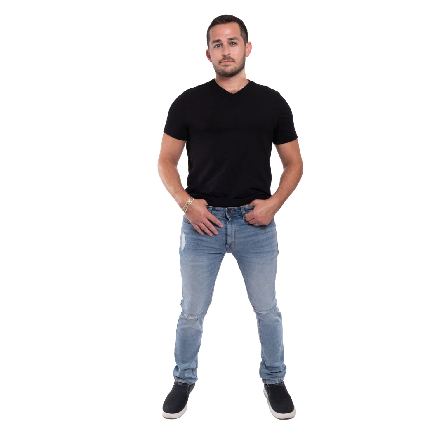 Made from our special stretch SUSTAINABLE fabric, then shredded at the knees to make him even sexier. We used BCI cotton and modified the synthetic fibers to be made from RECYCLED plastic bottles. Yes, he’s a light blue wash, but on the inside, he’s green as f#!k.
